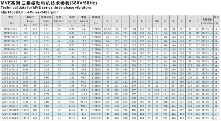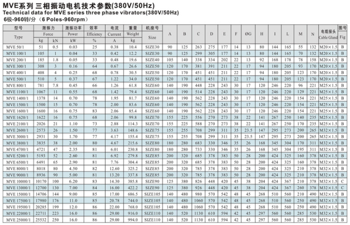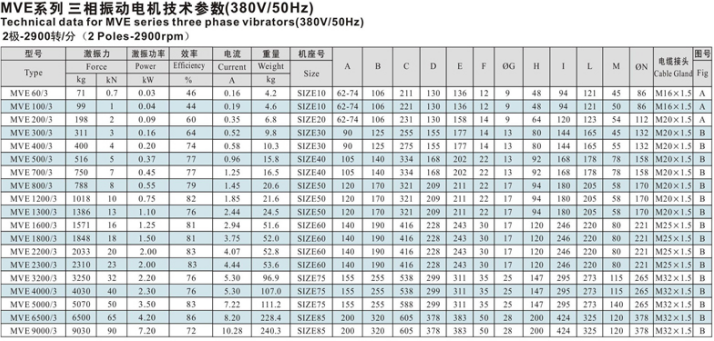 三、MVE系列振動(dòng)電機(jī)技術(shù)參數(shù):